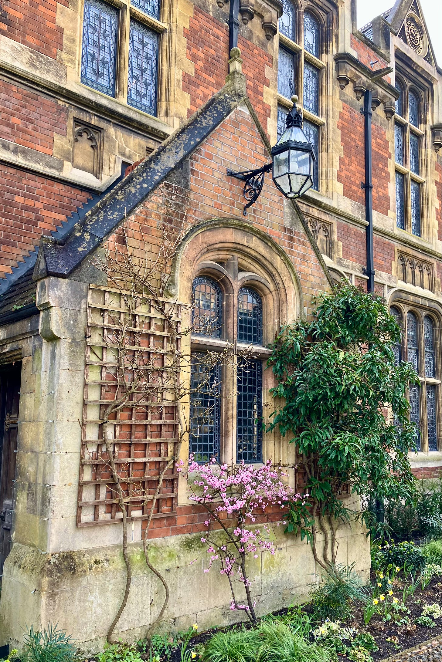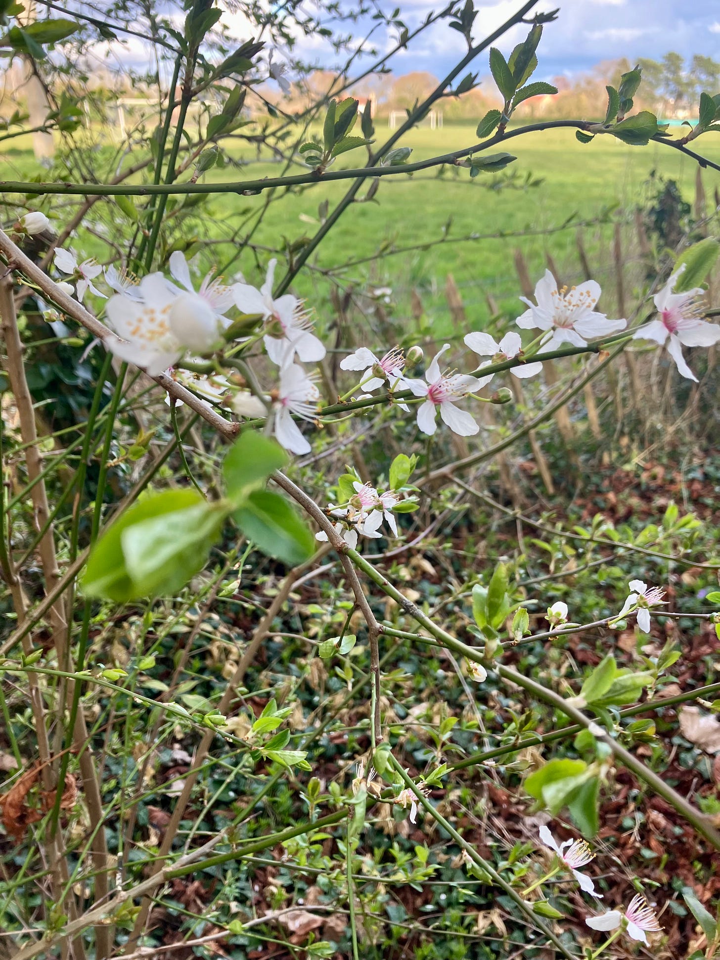There’s no blossom on the Bramley yet, only on the plums. I reach out and run my fingers across the dips in the brick of the shed, admiring the ochres and pinks against the washed moss in the lawn and patches of blue Bossier’s Glory Snow.