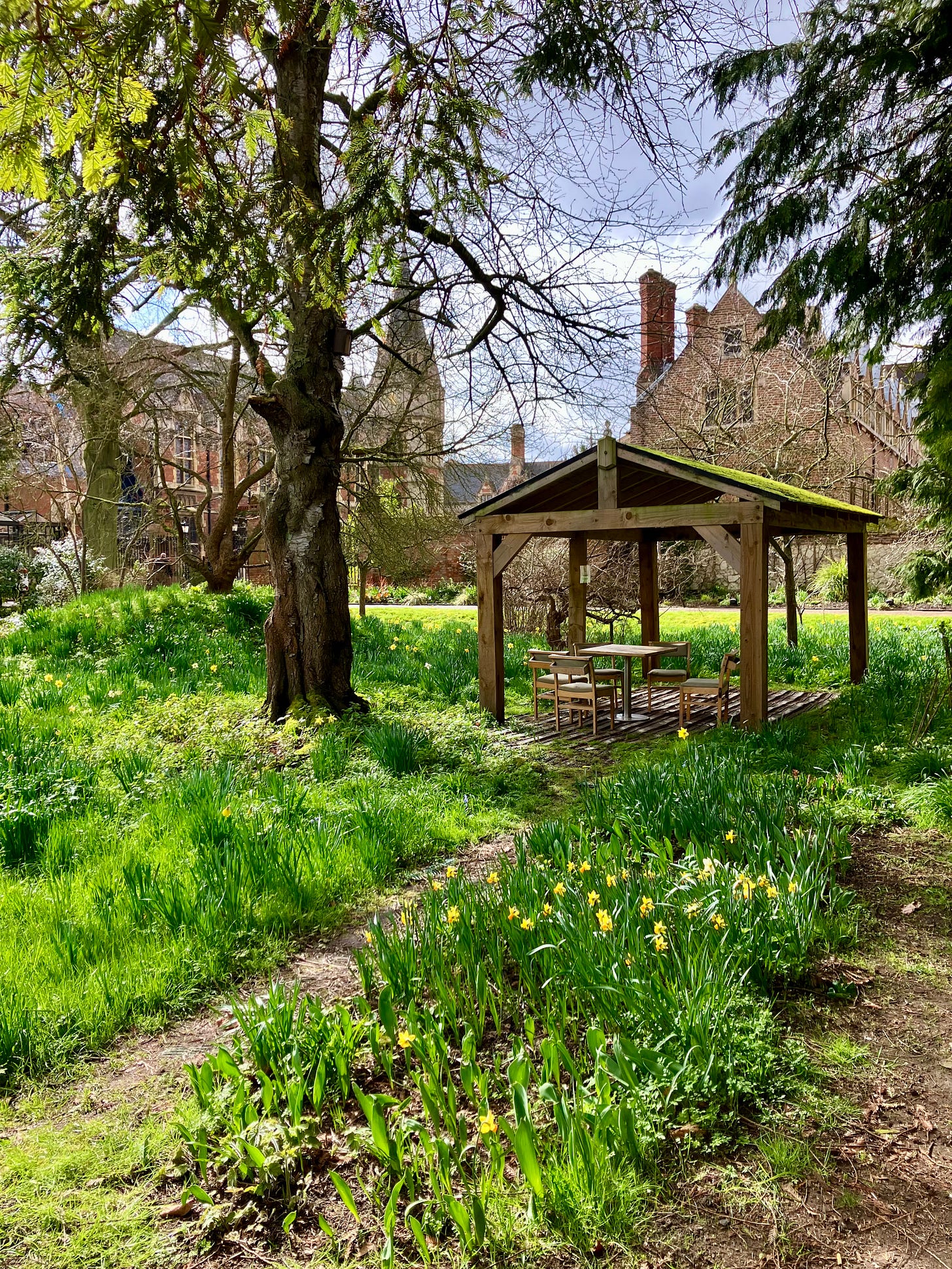 I enter through the side gate, wanting to feel the freshness of the garden after the rain, admiring the aconites flanking the path as I crunch over snail shells. A robin darts onto a low branch of the apple tree and watches me. I smile and say hello.